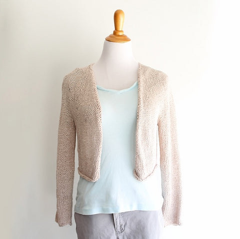 Quicksand is s a simple, top-down cardie made with Quince & Co Kestrel. The colour is ‘Senza’, an ecru. I modified the pattern and made it cropped, so I only used 6 skeins instead of 8. I also made one size smaller than I would normally wear (all the details are in my Ravelry Notes). You may see me wearing it around the store, it has become one of my summer wardrobe staples.