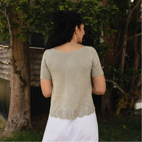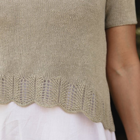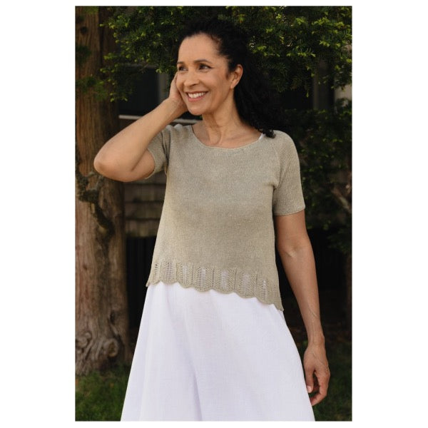 Tee is worked from the top-down in the round, with raglan sleeve shaping and a simple lace stitch at the hem. The neckline and hi-lo hem are shaped with German short rows. The hem, sleeve, and neckline edges are finished with an i-cord bind off. Instructions for a seamed or seamless i-cord bind off are provided. Charts and line-by-line instructions included.