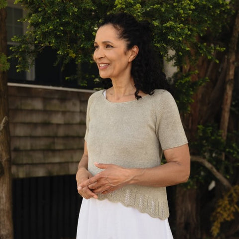 Affinitee is defined as a spontaneous liking for something, and that’s exactly how we felt when we first saw Rebekah Berkompas’ splendid knit tee. Shown here in colorway Frond and worked from the top down, an elegant silhouette and delicate stitchwork become the star of the show. Affinitee’s beautiful lace hem showcases the lustrous glow of Quince & Co Sparrow’s organic linen fiber, as wonderful to wear as it is to knit!