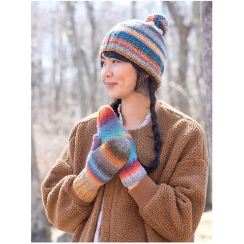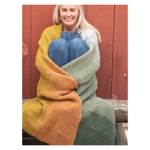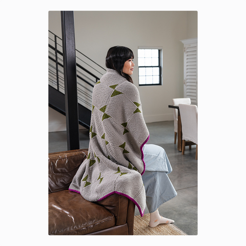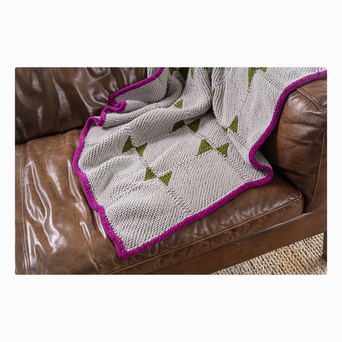 Each square of Peggy is worked separately from corner to corner for mindless and portable garter stitch knitting. Once assembled, the applied I-cord border completes this striking blanket with a high-contrast frame that pops.
